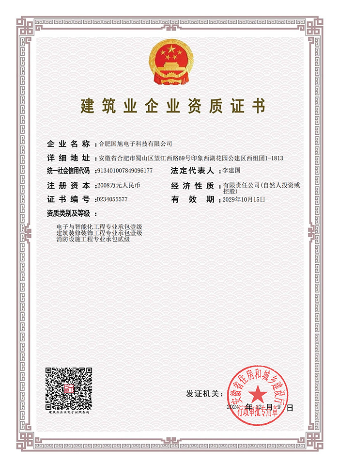 公司現(xiàn)已獲得承裝(修、試)電力設(shè)施許可證、電子與智能化工程專業(yè)承包壹級(jí)資質(zhì)、建筑裝修裝飾工程專業(yè)承包壹級(jí)資質(zhì)、消防設(shè)施工程專業(yè)承包貳級(jí)、安全技術(shù)防范行業(yè)壹級(jí)資質(zhì)、雷電防護(hù)裝置檢測資質(zhì)證乙級(jí)資質(zhì)、安全生產(chǎn)許可證、通過ISO9001:2015質(zhì)量管理體系認(rèn)證、ISO14001:2015環(huán)境管理體系認(rèn)證、OHSAS18001:2007職業(yè)健康安全管理體系認(rèn)證等榮譽(yù)。我們還將進(jìn)一步努力,爭取贏得更多的榮譽(yù)。